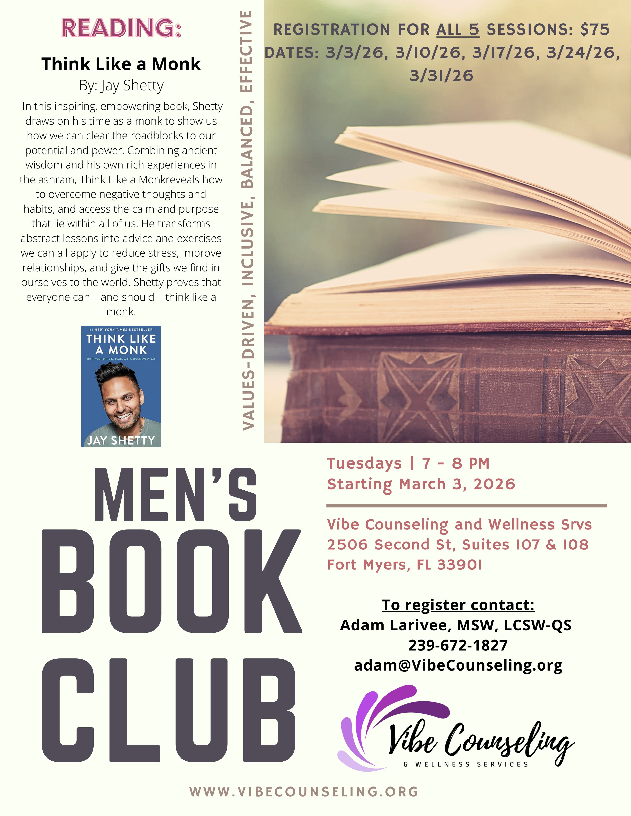This men’s book club is a space for connection, reflection, and personal growth. Through guided discussion of meaningful readings, participants will explore identity, relationships, emotional awareness, and life purpose in a supportive, judgment-free environment. Whether you’re new to personal growth or continuing the work, this group invites honest conversation and deeper self-understanding alongside other men walking a similar path.